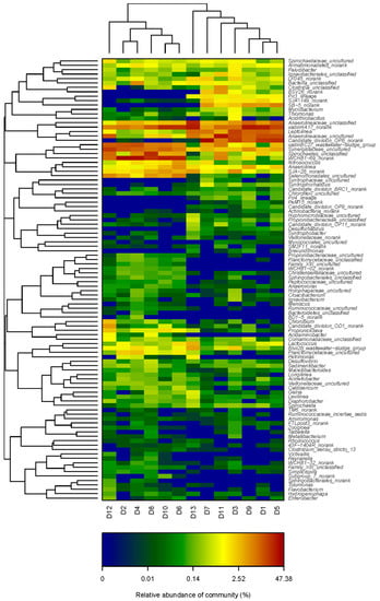 The heatmap shows the relative abundance of different bacteria genera found in the samples, as presented in Figure 5. It can be seen that the representative genera were different between the two bioreactors.