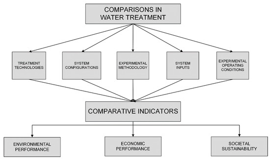 Overview of different types of comparative studies on water treatment and the use of comparative indicators.