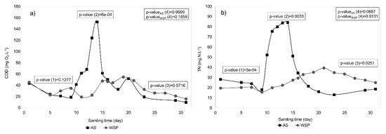 The effluent concentrations of the systems during the peak scenario were demonstrated with the p-values of the statistical tests in Figure 4. In general, the two systems reacted in different patterns during the disturbance. For instance, during the high-strength-wastewater period, the removal efficiencies of AS for COD dropped 20%, while WSPs could still maintain low COD concentrations in the effluent, leading to very low p-values (<0.001). The differences in the performance of two systems were more obvious in case of TN, with low p-values for each phase-based comparison between systems. Although the TN concentration of AS almost tripled during the peak, the systems were able to recover quickly within five days. On the other hand, WSP could keep their TN effluent concentrations low during the disturbance but were not able to recuperate to their initial values by the end of the experiment. This observation is supported by the significant difference obtained for TN concentrations in the initial and recovery phase within the WSP system (p = 0.013), while the difference within the AS system was not considered to be significant (p = 0.089).