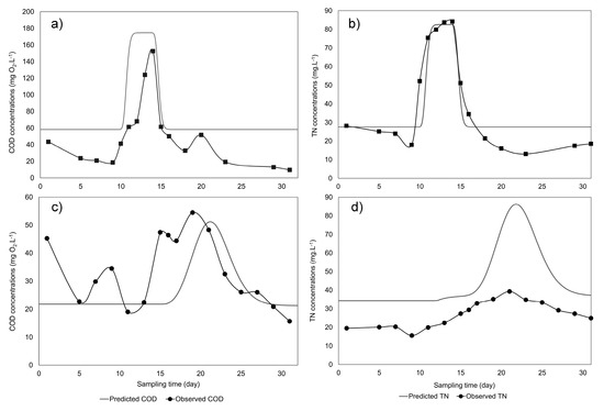 Predicted and observed effluent pollutant levels of conventional activated sludge ((a) and (b)) and waste stabilization pond ((c) and (d)) systems during the shock load scenario.