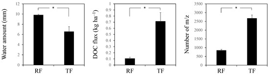 The amount of water sampled, dissolved organic carbon (DOC) flux, and the number of molecular species of dissolved organic matter (DOM) in bulk deposition (rainfall: RF) and throughfall (TF). Error bars represent standard deviations. An asterisk in the figure indicates that there is a significant difference between RF and TF (U-test, p < 0.05).