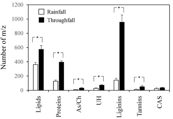 The number of dissolved organic matter (DOM) molecular species classified into seven biomolecular classes, i.e., lipids, proteins, aminosugars/carbohydrates (As/Ch), unsaturated hydrocarbons (UH), lignin-like molecules (lignins), tannin-like molecules (tannins), and condensed aromatic structures (CAS) in bulk deposition (rainfall) and throughfall. Error bars represent standard deviations. An asterisk in the figure indicates that there is a significant difference between rainfall and throughfall (U-test, p < 0.05).