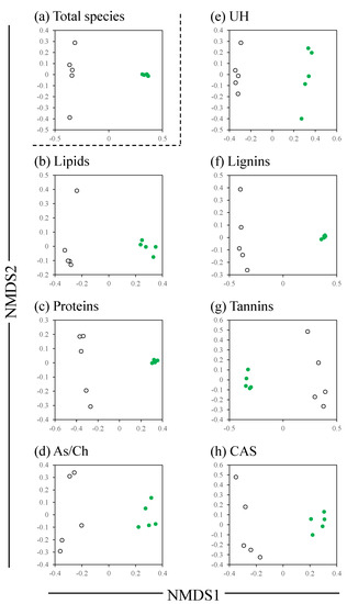 The NMDS showed that DOM molecular species were significantly differentiated between rainfall and throughfall (Figure 3a; perMANOVA, p < 0.01). All seven biomolecular species were also significantly differentiated (Figure 3b–h; perMANOVA, p < 0.05 in all cases). The dissimilarity of the total molecular species among sample replicates on the two-dimensional ordination of NMDS was much smaller in throughfall than in rainfall (Figure 3a). The same trends were found for proteins and lignins (Figure 3c,f).