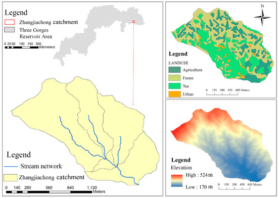 The case study focuses on the Zhangjiachong catchment. It is in the upstream of the Three Gorges Reservoir (TGR) area, China. Figure 1 shows its location and spatial features. The total catchment area is approximately 162 ha. It is a typical small catchment in the TGR area because of its location, topography, climate, land use, and agricultural management. It is a sub-catchment of the Moping River catchment, which is a tributary to the Yangtze River. This catchment has hilly areas in the middle and upper part. The soil in the Zhangjiachong catchment is named as the yellow-brown type based on the China Soil Scientific Database. It is derived from granite or sandstone and is categorized as Alfisol in the soil taxonomy system of China. The yellow-brown soils are moderately leached, with a large soil bulk density and low porosity and permeability [37]. The land use is agriculture-dominated with local crops such as rape, corn, chestnut, and tea. Forest land occupies 42.9% of the total area. Only 2.1% is used as urban land. The mean annual air temperature and the annual precipitation are 18 °C and 1439 mm, respectively. The Zhangjiachong catchment is susceptible to severe soil erosion. As reported by the local water and soil conservation bureau, the soil erosion area caused by storm events had reached to 60% of the total area in 2001. The fertilizer amount is relatively high, especially on the tea lands, which accelerates plenty of nutrient losses into receiving waters.