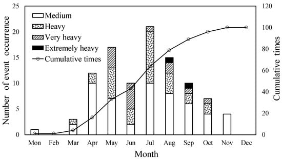 The event separation method used in this study is based on previous research [38,39,40]. Two rainfall–runoff events were separated into two independent events if there was a continuous dry period of at least six hours. In this study, precipitation amount was used to classify rainfall–runoff events to be different types in previous research. This solution is computationally simple and straightforward but intended to facilitate streamflow forecasting and risk management [38,41,42,43,44]. The specific criterion is presented in Table 1. It should be mentioned that based on the monitoring experiences, the increased water level at the catchment outlet by light events was rarely more than 2 cm, which suggests that runoff generation was quite limited. Therefore, rainfall–runoff events of a light type (i.e., the accumulated rainfall amount was between 0.1 mm to 9.9 mm in 24 h or between 0.1 mm to 4.9 mm in 12 h) were excluded in this study. Torrential events did not occur so this type was also not considered. The other four event types, including medium, heavy, very heavy, and extremely heavy, were analyzed in this catchment. Their occurrence among different months are shown in Figure 2. Rainfall–runoff events in the Zhangjiachong catchment mainly occurred during April to October. The largest number of events were during July. The medium, heavy, and very heavy events happen most frequently in April, July, and June, respectively. Compared to other types of events, the number of extremely heavy events were rather small and they only took place in August and September. According to the analysis of the event characteristics, 12 rainfall events (Table 2) were selected for the subsequent event-based modeling. The rainfall amount varied between 18.2 mm and 104.7 mm, covering event types from medium to extremely heavy. The event duration ranged from 2 h to 20 h. Short intense events were represented by 3-h duration with a maximum intensity of 40.5 mm/h, and long-lasting but very light events were represented by 20 h duration with a maximum intensity of only 4.4 mm/h. Among the 12 selected events, numbers 1 to 6 were chosen for calibration, and the rest was used for validation.