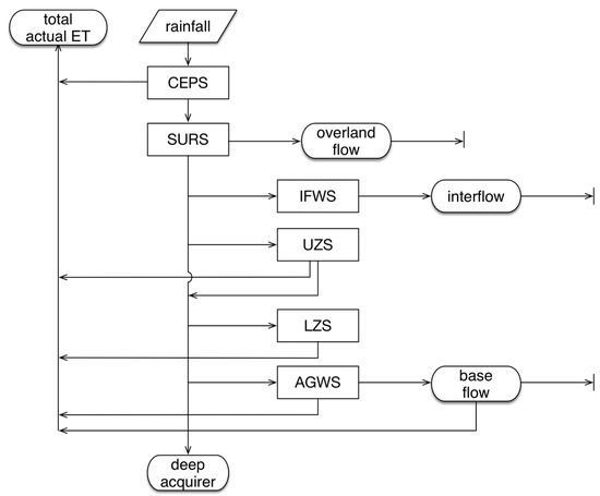 The HSPF model is flexible enough to operate at time steps from 1 min to 1 h and to present output results daily and hourly. Importantly, both long-term (daily) hydrographs and event-based (hourly) hydrographs can be obtained. It divides a watershed into three modules: pervious land segment (PERLND), impervious land segment (IMPERLND), and reach segment (RCHRES). Fluxes and storages represent the movement and state of moistures. An outflow from a storage is typically calculated based on the current storage amount and the conceptual coefficients. Soil storages control the soil moisture rate and gravity drainage by infiltration and percolation. Evapotranspiration (ET) withdraws moistures from different storages. Part of the infiltration was directly drained into deep aquifers. Surface flow, interflow, and base flow contribute to the receiving water. A flow chart of water movement and storages represented in the PERLND module is presented in Figure 3. Key parameters for hydrologic modelling in the PERLND module were listed in Table 3. CEPSC controls the canopy interception; LZSN is the lower zone nominal storage; INFILT is the soil infiltration rate, while INTFW is the interflow coefficient. LZSN, INFILT, and INTFW are critical to determine gravity drainage of the moisture. UZSN is the upper zone nominal storage that controls the inflow to the upper zone and percolation amount. IRC is the recession coefficient of interflow, AGWRC and KVARY are two groundwater parameters used to calculate the amount of base flow, and DEEPFR is the fraction of the groundwater that enters the deep acquirer. BASETP, AGWETP, and LZETP are the three key parameters determining evapotranspiration. The RCHRES module assumes a water body as a single reach of an open or closed channel, or a completely mixed lake. The hydraulic processes of unidirectional flow will be simulated using this module. The geometric and hydraulic properties of a specific reach are summarized in a function table that facilitates in calculating flow routing [24]. Two essential files are required to run the HSPF model, that is the user control input (UCI) file and the watershed data management (WDM) file. The UCI file configures the parameter settings and module setup. The WDM file stores the time series of climate forcing and simulation results.