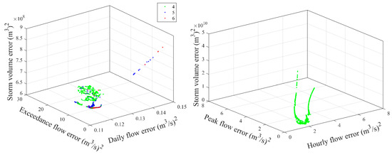 Pareto sets achieved by the multi-objective calibration. The left part is for the continuous modeling, where green, blue, and red dots represent solutions those that achieved four, five, and six criteria of the HSEXP statistics, respectively. The right part is for the event-based modeling, where green dots represent all the Pareto solutions. The original MATLAB figure files (Pareto front-continuous scenario.fig and Pareto front-event-based scenario.fig) are provided as Supplementary Materials.