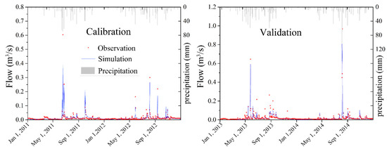 Hyetograph, simulated and observed hydrographs in the calibration and validation periods for the continuous modeling.