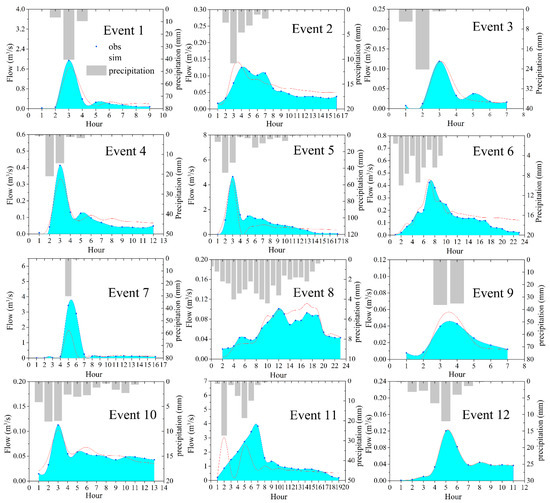 Hyetograph, and simulated and observed hydrographs in the calibration and validation periods for the 12 rainfall–runoff events.