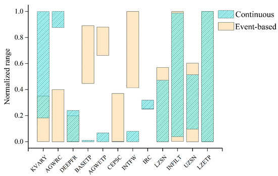 The comparison of parameter estimation in the different scenarios is an important way to build reliable models. The optimized ranges for each parameter were normalized for comparison and are plotted in Figure 8. The BOP values of the two conditions are also listed in Table 3. The water balance for each component in the two scenarios are presented in Table 6 to support the data analysis. The similarity between the two scenarios in terms of optimized ranges and BOP values was high for DEEPFR and IRC. DEEPFR is highly dependent on the watershed topography, thus its value may be constant during changes in the two scenarios. The BOP values of DEEPFR (0.056 and 0.057) were both very small, which can be corroborated by the percentage of deep aquifer in the water balance. The BOP values of IRC in the two scenarios were both calibrated to the pre-defined minimum bound, indicating very steep slopes of recession limbs of hydrographs. The precipitation in the Zhangjiachong catchment is characterized by large peaks and sudden decreases. Thus, the low value of IRC was possibly due to the sensitive and fast response to rainfall in this small catchment. The BOP values of LZSN, UZSN, and INFILT in the continuous modeling were higher than those in the event-based modeling. The continuous scenario consisted primarily of dry seasons when the base flow represented a large portion of the streamflow. Rainfall–runoff events were much more likely to result in overland flow and interflow, which can be seen in Table 6. Thus, higher values of LZSN and UZSN in the continuous modeling led to more water being retained in the soil zones and being available for base flow. Lower values of INFILT in the event-based modeling led to more moistures in the upper zone and in interflow storage, therefore resulting in more overland flow and interflow.