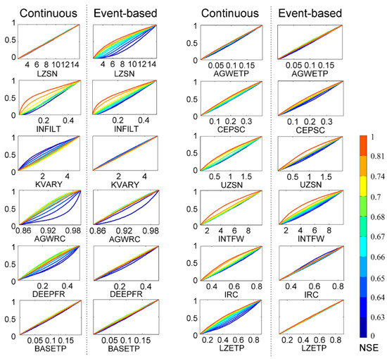 Comparison of parameter sensitivity between the continuous and event-based modeling Cumulative normalized Nash–Sutcliffe efficiency were plotted against parameter values. Parameter populations from best to worst are ranked and divided into ten bins of equal size.