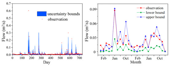 Observations and 95 PPU bounds of streamflow in the continuous modeling. The left and right parts present results of daily and monthly simulation, respectively.