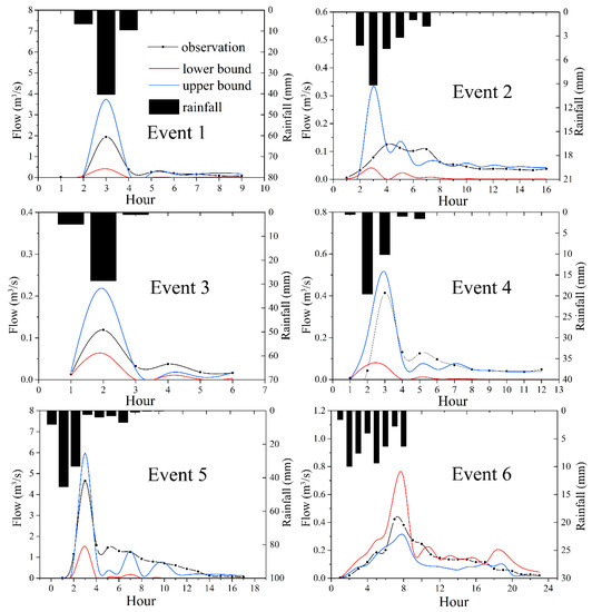 Figure 11 illustrates the simulated hourly flows at the 95% quantile against observations for each of the six calibrated events. The overall performance of the event-based simulation was better than that of the daily simulation according to p-factors and r-factors. The observed peak flows were all bracketed by the uncertainty bands, implying the robust ability of the HSPF model in simulating peak flows in rainfall–runoff events. The event-based model showed the best performance for the medium events (event 2) with p-factor and r-factor values of 68.75% and 0.52, respectively. Generally, the performance of GLUE estimation decreased as the precipitation became intense. It is worth noting that at the beginning of rainfall–runoff events, the uncertainty bounds were often too narrow to cover the observed values. Similar outcomes were found in Sun et al. [71] in a context of GLUE application on streamflow forecasting in an urbanized catchment. Vezzaro and Mikkelsen [72] conducted uncertainty assessment for simulating micropollutants in stormwater runoff. These deficiencies of the results revealed the structure error of the models on the event basis. In rising limbs of rainfall–runoff events, the precipitation amount is rather small. Parameters related to moisture distribution and runoff generation are supposed to be dominant but cannot be fully activated at the initial event stage. Besides that, the characteristics of the analyzed dataset may also contribute to the deficiencies. The initial flows are rather small in magnitude and proportion compared to the others, which may be treated as outliers in constraining uncertainty bounds by the GLUE method.
