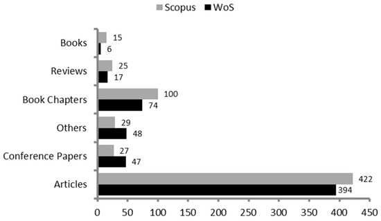 Due to the wide range of types of documents that the databases collect (Figure 1), in our work only articles that were published in scientific journals of proven quality benchmarks were selected through a blind peer review process [45,46], the representativeness of the documents was also taken into account (816 articles), and that the articles are chosen as a unit of analysis in bibliometric research [47].