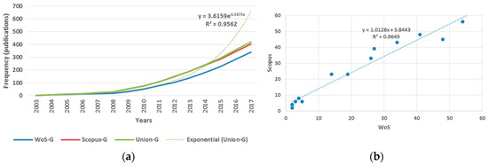In this same Figure 3, a strong correlation between articles that were indexed by year in WoS and Scopus can also be seen, with R2 = 0.9649, although the growth curves are separated from the year 2008.