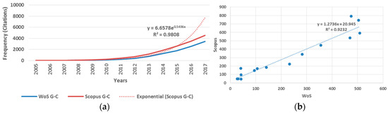 The 340 articles in WoS received a total of 3355 citations, which averaged 9.87 citations/document. From the perspective of the h-index = 28, of the total of 340 articles, 28 articles received 28 citations or more in the analysed period. Regarding Scopus, its 402 articles obtained a total of 4587 citations with an average of 11.4 citations/article and an h-index = 34. Throughout the 2003–2017 study period, the growth in the number of citations that the total number of articles receives per year is constant, reaching 884 citations in WoS and 1051 in Scopus in 2017 (Figure 4). The Hirsch Index [50] (p. 16569) “is a quantitative method to evaluate the total effective output of a researcher”, it provides an unbiased evaluation that represents it through a predictive value (number) [52], thus providing “an estimate of the importance, significance, and broad impact of a scientist’s cumulative research contributions” [50] (p. 16569).