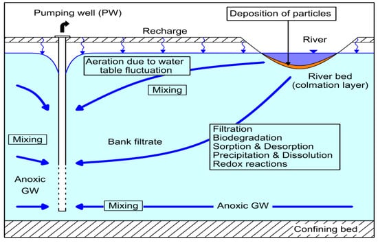 A schematic diagram of processes affecting water quality during riverbank filtration and groundwater (GW) [4].