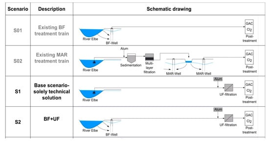 The ultrafiltration plant was operated in the second largest waterworks in the city of Dresden, which is located at the Elbe River. This waterworks has a total capacity of 72,000 m3/day, and 111 vertical siphons wells and 36 wells with submersible pumps that extract bank filtrate from a depth of 5–8 m at a distance of 60–120 m to the river. After extraction, the water is aerated and filtered through activated carbon before it is disinfected with chlorine and distributed as drinking water (Figure 3, Scenario S01).