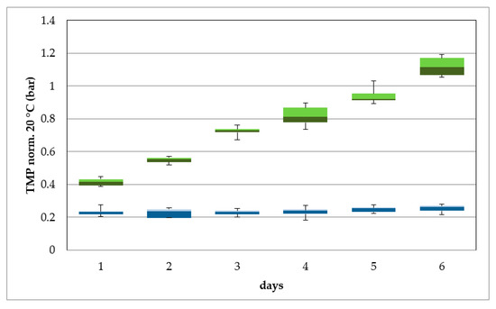 The fouling potential was assessed through the difference of the normalized transmembrane pressure (TMP) at 20 °C over the operating time. It is characterized by the TMP increase over the operating time and has a major impact on the amount and type of cleaning process as well as energy consumption. Figure 5 shows the fouling potential at a flux of 50 (L/m2 h) for UF 1 as an example.