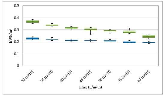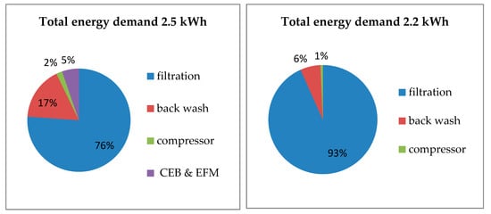 Depending on raw water quality and associated operation settings for cleaning, membrane pressure, and flux, the energy consumption was 0.23–0.18 kWh/m3 for bank filtrate and 0.34–0.26 kWh/m3 for river water (Figure 6).
