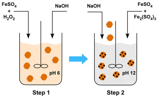 The studied Fe3O4/FeOOH nanocomposites were synthesized in a batch reactor by the sequential precipitation of iron salts under different acidity and oxidative conditions (Figure 1). Particularly, in the first step, the iron oxy-hydroxide was prepared by the precipitation of FeSO4 at pH 6 and a redox of 300 mV controlled by the addition of NaOH and H2O2 solutions, respectively. A quantity of 6.5 g of FeSO4·7H2O was added in a 600 mL glass beaker and dissolved in 400 mL of distilled water under mechanical stirring. Then, a proper volume of 5 wt % NaOH solution was rapidly added to increase the pH up to 6, while another volume of 5 wt % H2O2 was introduced to establish the required redox potential. Immediately, the formation of a brown precipitate was observed. The reaction mixture was kept under slow stirring for one hour to allow ageing of the product and then the solid was washed several times with distilled water to eliminate reaction byproducts and oxidative residuals. A neutralized dispersion of 2 g FeOOH on dry basis was received at a volume of 200 mL and placed in a second beaker to serve as a seed for the precipitation of Fe3O4 nanoparticles by FeSO4 and Fe2(SO4)3. In the second step, a solution prepared by the dissolution of 2.4 g of FeSO4·7H2O and 3.6 g of Fe2(SO4)3·xH2O (20 wt % Fe basis) into 200 mL of distilled water was mixed with the FeOOH dispersion. Such proportions correspond to the synthesis of the nanocomposite with a 50 wt % content in Fe3O4. Then, a quantity of 5 wt % NaOH solution was added to achieve a pH value 12 and allow the formation of a black precipitate consisting of Fe3O4 nanoparticles. After another hour of ageing, the final product was washed with distilled water, centrifuged and dried at room temperature. To modify the Fe3O4 content of the final product, the quantities of FeSO4 and Fe2(SO4)3 were varied proportionally. The Fe3O4/FeOOH nanocomposite was used in adsorption experiments in the form of ground powder sieved below 63 μm.