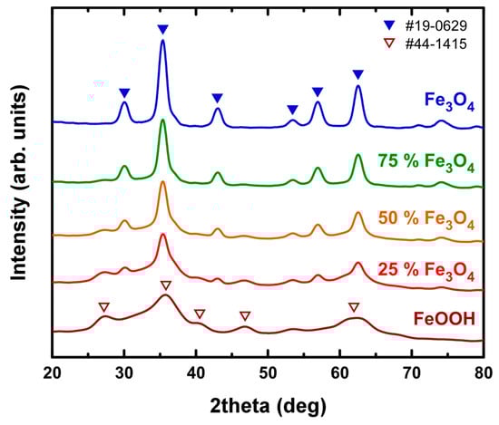 X-ray diffraction diagrams of studied Fe3O4/FeOOH nanocomposites. Triangles indicate the expected diffraction angles for magnetite and ferrihydrite from the ICDD/JCPDS PDF Database [].