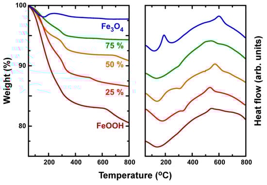 The percentage of structural hydroxyls is another indirect parameter to evaluate sample composition. In particular, magnetite-rich samples should present a much lower weight loss during TG-DTA analysis. Indeed, Figure 3 shows a total loss of 20 wt % in the mass of pure FeOOH which proportionally decreased with the gain of Fe3O4 percentage. Around 17 wt % of it corresponds to the removal of adsorbed water and the dehydroxylation process occurring in the range 100–300 °C, which is attached to a broad endotherm peak in the DTA curve. The presence of Fe3O4 initiates a weak increase of the mass at 200 °C which can be attributed to the adsorption of oxygen traces still existing in the nitrogen flow. Such an effect splits the dehydroxylation in a second endothermic step around 300 °C. The exothermic peak in the range 550–620 °C for all samples is indicative of maghemite transformation to hematite. Finally, the drop of mass in the FeOOH-rich samples above 630 °C is explained by the release of crystallized water molecules originating from the initial ferrihydrite structure.