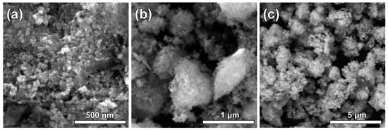 The morphology of the combined phases has been examined through SEM observations (Figure 4). The separate preparation of single-phase Fe3O4 by chemical co-precipitation under alkaline conditions is known to result in spherical nanoparticles sized around 40 nm []. The image of Figure 4a verifies the small dimensions of building units in the sample. On the contrary, pure FeOOH consists of large grains with high surface roughness and high porosity (Figure 4b) in agreement with the low dimension crystallinity shown in the X-ray spectra. The sequential formation of the two phases contributes to the production of a nanocomposite where Fe3O4 nanoparticles are distributed on the surface of the FeOOH grains (Figure 4c).