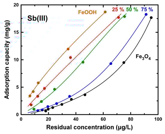The efficiency of synthesized Fe3O4/FeOOH nanocomposites to capture antimony species was studied by the corresponding adsorption isotherms obtained at low residual concentrations. Figure 5 summarizes the results concerning the removal of Sb(III) at pH 7. In FeOOH-rich samples, isotherms indicate higher capacities where fitting is successful by the Freundlich relation (Equation (1)). However, when the Fe3O4 percentage eclipses 50 wt %, the obtained isotherm pattern is significantly modified, suggesting a low-affinity adsorption which is better expressed by the BET equation (Equation (2)). The adsorption capacity of pure FeOOH at a residual concentration of 5 μg/L is found around 2.8 mg/g but rapidly falls as higher quantities of Fe3O4 nanoparticles are added to reach 0.27 mg/g for pure magnetite.