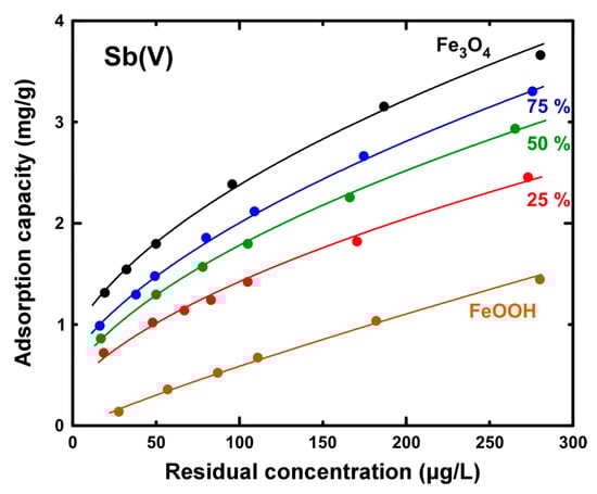 In spite of its negative role in Sb(III) uptake, the incorporation of Fe3O4 nanoparticles clearly promotes Sb(V) adsorption which is actually the milestone of this study. The importance of Fe3O4 presence is signified by the shift of isotherms from the zero values, at the range of drinking water regulation limit for pure FeOOH, to significant adsorption capacities (Figure 6). Particularly, the estimated Q5-value gradually increases from 0.29 up to 0.45 mg/g almost proportionally to the Fe3O4 percentage. All isotherms follow a Freundlich-type trend concluding a high affinity for adsorption.