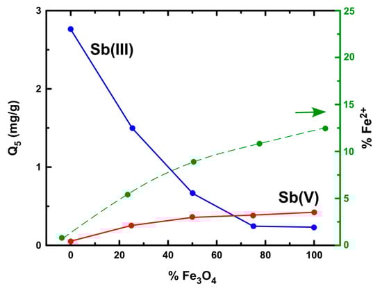 The addition of a reducing phase such as Fe3O4 in typical water adsorbents like iron oxy-hydroxides indicated an improvement in the uptake of Sb(V) species with respect to the realization of residual concentrations below 5 μg/L. An overview of the enhancing trend in correlation to the percentage of Fe3O4 nanoparticles in the nanocomposite is shown in Figure 7. In addition, the improvement of adsorption capacity and affinity at higher Fe3O4 percentages is also reflected in the increase of KF and decrease of 1/n (Table 1). Considering that even freshly prepared ferric hydroxides cannot bring Sb(V) removal capacities above 0.1 mg/g for equilibrium concentrations of 10 μg/L [], the Q5-values of at least 0.3 mg/g support the important contribution of Fe3O4 in efficiency improvement. The ability of Fe3O4 to operate as electron donor enables the reduction of Sb(V) to Sb(III) oxy-ions which are then captured by the iron oxy-hydroxide that shows higher affinity to antimonite species. The effect of Fe oxidation state in the adsorption capacity for Sb(V) has been also observed for reduced nontronite [], whereas the high affinity of ≡FeOH sites for antimony species has been demonstrated in iron-oxide-rich red-earth soils []. In a similar approach, the combination of an oxidative manganese compound with an iron oxy-hydroxide adsorbent, in single- [] or binary-phase [] materials, was applied as a sophisticated way to oxidize As(III) and then capture it as As(V).