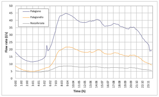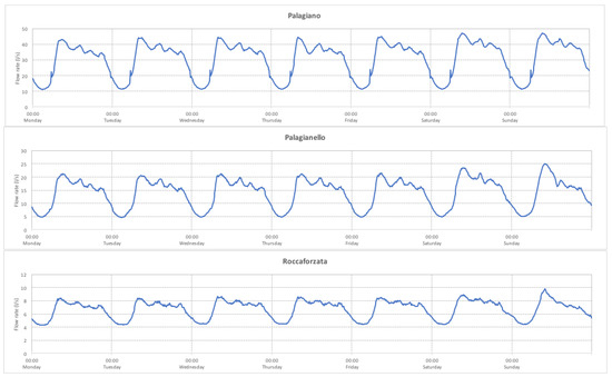 A preliminary analysis of data [23] highlighted the daily periodicity, as well as a weekly periodicity in water demand. As is well known, daily variability and peak water demand are strongly influenced by habits and activities of inhabitants, however, an analysis of the daily demand pattern (Figure 1) shows a certain synchronicity of the main daily peak in all the three towns. Observing the daily pattern for Palagiano a singular peak can be observed in the morning (05:00–06:00) probably due to the dominant working activity represented by agriculture.