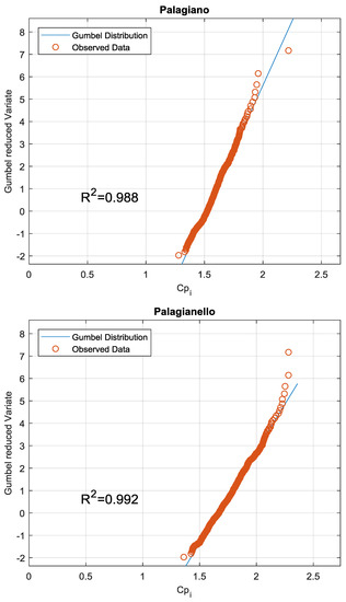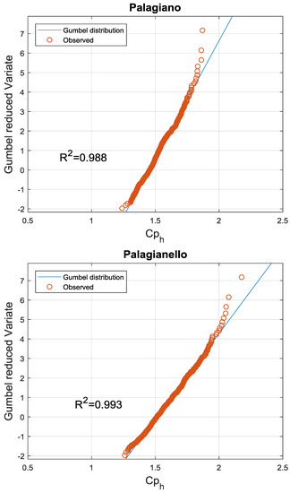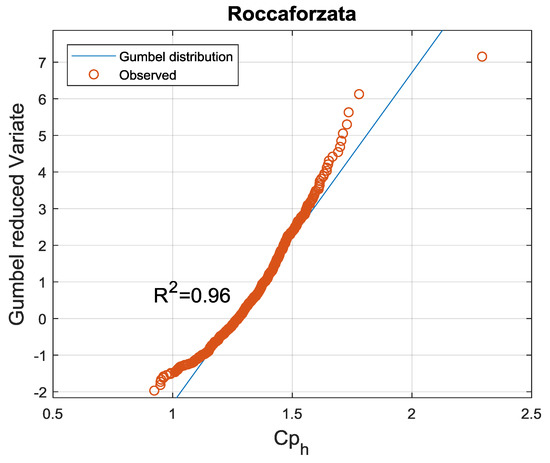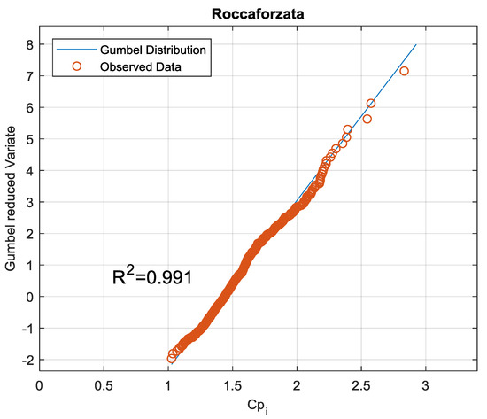 We compared the observed values of each annual series of data available with those deriving from the application of the Gumbel law. Figure 3 shows a good fit between the empirical quantiles of the peak coefficient and the Gumbel distribution in every annual observed time series. The Gumbel parameters, where estimated by means of the classical method of moments assuming the sample values of the mean μ and the standard deviation σ reported in Table 1.
