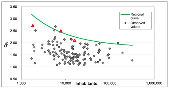 In Figure 5 the regional relationship (green curve) is shown along with the observed values extracted from the measurement campaign conducted on 150 towns in Puglia data (grey rhombs) and with the Peak flow factors (red triangles) evaluated as the 99.9th percentile of the at-site Gumbel distribution (described in Section 4) fitted to the time series recorded in Roccaforzata, Palagianello and Palagiano. The behavior represented in Figure 5 confirms the good behavior of the theoretical regional curve and also allow for other considerations to be discussed in the following section.