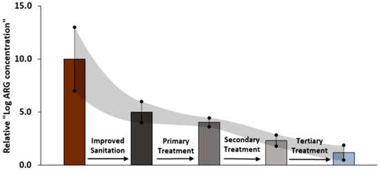 - Quach-Cu, J.; Herrera-Lynch, B.; Marciniak, C.; Adams, S.; Simmerman, A.; Reinke, R.A. The effect of primary, secondary, and tertiary wastewater treatment processes on antibiotic resistance gene (ARG) concentrations in solid and dissolved wastewater fractions. Water 2018, 10, 37. [Google Scholar] [CrossRef]