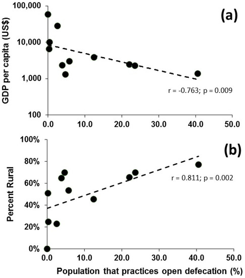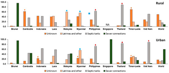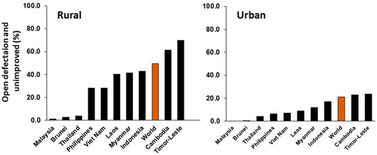 - WHO/UNICEF Joint Monitoring Programme (JMP) for Water Supply and Sanitation (wssinfo.org). People Practicing Open Defecation (% of Population). Available online: https://data.worldbank.org/indicator/SH.STA.ODFC.ZS?locations=BN-KH-TL-ID-LA-MY-MM-PH-SG-TH-VN&view=chart (accessed on 29 October 2018).