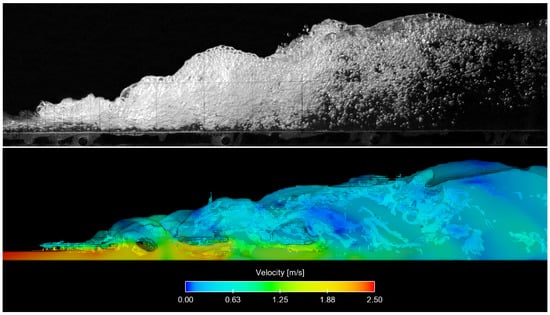 Hydraulic jump with an inlet Froude number of around six. Flow from left to right. Top: experimental model from Valero et al. [4]; bottom: numerical model from Bayon et al. [5]. Transparency has been used to allow entrained air visualization.