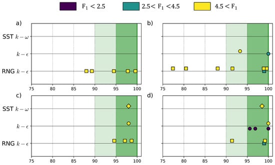 Figure 3 shows the accuracy of previous RANS models with standard , RNG , and the SST turbulence models. In Figure 3, the results are also classified by Froude number; following the jump typology of Bradley and Peterka [92] (see Part 1). The RNG model comparatively provided the best performances for all four jump parameters, despite is also showing the largest scatter. The standard model provided more accurate results in terms of the roller length and the free surface.