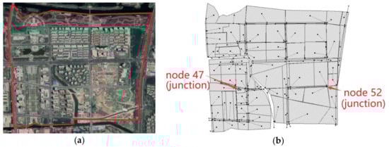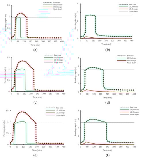 There have been few studies on local nodes, this paper analyzes and discusses nodes with flood, so as to improve the reliability of the conclusion. Since node 47 (junction node) and node 52 (junction node) are two nodes with the longer ponding time and more ponding depth in Base case, they are selected as typical ponding nodes for analysis and discussion, as shown in Figure 1b. Influences of different types of LID on local ponding regions are shown in Figure 6 and Figure 7, respectively.