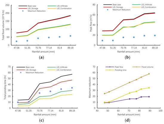 Runoff reduction varies greatly with rainfall amounts. When the rainfall amount is 47.06 mm, the maximum reduction of flood volume during the continuous rainfall–runoff process (240 min) is 24,470 m3. When the rainfall amount is 89.18 mm, the maximum reduction of flood volume can reach 57,850 m3 during the continuous rainfall–runoff process (360 min). When the rainfall amount is 47.06 mm, the maximum reduction of peak flow is 9.24 m3/s. When the rainfall amount is 89.18 mm, the maximum reduction of peak flow is 19.2 m3/s. When the rainfall amount is 47.06 mm, the maximum reduction time is 13.48 h. When the rainfall amount is 89.18 mm, the maximum reduction time can reach 57.26 h. As shown in Figure 8a–c. Under all the LID designs, runoff reduction gradually increases with the increasing rainfall amount, peak reduction becomes stable when rainfall amount reaches about 81.8 mm. As shown in Figure 8d. In general, maximum reduction rates are ranked as follows: flood volume > ponding time > peak flow.