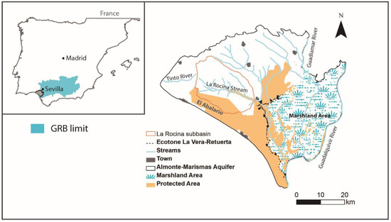 - Serrano, L.; Reina, M.; Martín, G.; Reyes, I.; Arechedera, A.; León, D.; Toja, J. The aquatic systems of Doñana (SW Spain): Watersheds and frontiers. Limnetica 2006, 25, 11–32. [Google Scholar]
