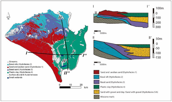 - Salvany, J.M.; Custodio, E. Características litoestratigráficas de los depósitos pliocuaternarios del bajo Guadalquivir en el área de Doñana: Implicaciones hidrogeológicas. Rev. Soc. Geol. España 1995, 8, 21–31. [Google Scholar]