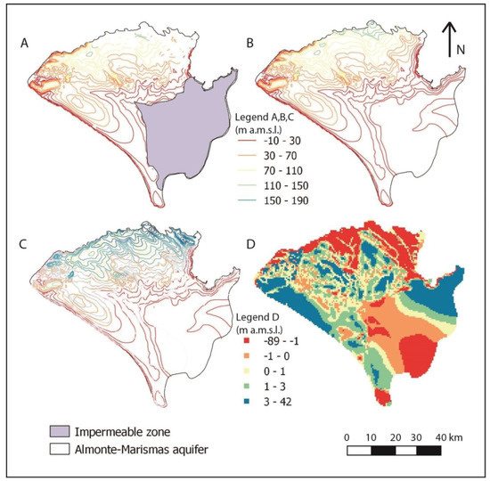- Instituto Geológico y Minero de España (IGME). Modelo Regional de Flujo Subterráneo del Sistema Acuífero Almonte-Marismas y su Entorno; Instituto Geológico y Minero de España: Madrid, Spain, 1999. [Google Scholar]