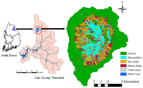 Using a mass balance approach to calculate P budgets is a commonly used approach in agricultural systems [5,6,7,8]. Continued accumulation of P in agricultural land beyond crop requirements may well become a long-term concern in Korea. Although there are many watersheds with mixed (forested and agricultural) land use distributed throughout most areas of Korea [9], no research has focused on constructing P budgets for these mixed land use watersheds. The current study was conducted in the Haean watershed, a subwatershed located at the upper reaches of Lake Soyang (the largest reservoir in South Korea). The study area is an advantageous location for studying the watershed P budget because it has only a single outlet (Mandae Stream). Previous studies on NPS of sediment and nutrient have conducted in the Haean watershed and the watershed is known as a hot spot for soil erosion and export of NPS pollution to Lake Soyang [4].