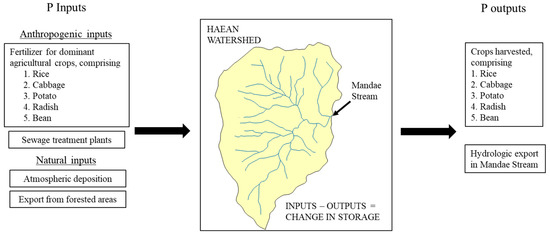 Schematic diagram of P inputs and outputs used to calculate the phosphorus budget for the Haean watershed.
