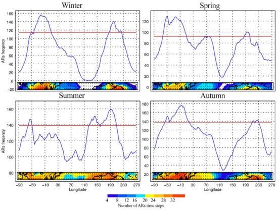 In order to define the areas of maximum AR occurrence, Figure 1 shows the number of ARs for each longitude from 55° to 65° N (line plot) and their geographical distribution for every season (colour band map). On these figures, blue lines represent the longitudinal variability in the number of ARs and the horizontal red line represents the value of its 75th percentile. Embedded at the bottom for every month, the AR frequency that appears represents every grid point over the longitudinal band previously defined. On this plot, reddish colours represent higher occurrence and bluish colours represent lower AR frequency.
