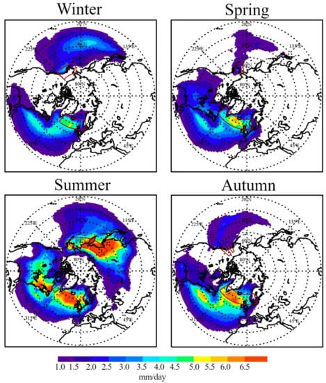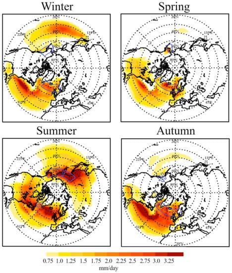 For the Pacific sector, the moisture sources are located mainly over the Pacific Ocean and eastern Asia. In winter, moisture uptake regions expand along the ocean from the western North Pacific to the Gulf of Alaska, with maximum located westward on the band between 30° and 40° N. In summer, however, the highest values of are located over continental areas. These areas show a remarkably intense moisture uptake with values higher than 3 mm/day over western Alaska and eastern Eurasia. In general, some moisture contribution to the ARs pathway box is observed over most of northern Eurasia. Moisture uptake is also observed over oceanic areas south of 50° N in the western Pacific; however, it shows values lower than 1.5 mm/day for most of the area. Higher values appear on northern latitudes over the Bering Sea and the Sea of Okhotsk. In spring and autumn, shows low values and extension. In spring, a small area with values lower than 1 mm/day appears over western Pacific between 30° and 40° N. Higher moisture uptake occurs over continental areas in western Alaska, coinciding with the position of the ARs pathway box. Finally, in autumn some moisture contribution to the box occurs over the Gulf of Alaska and a small area crossing the Pacific Ocean from west to east.