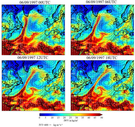 To exemplify the described phenomena, we have analysed a case study of an AR reaching the Arctic during 6 September 1997 within the Atlantic AR pathway box. This AR shows the maximum spatially integrated vapour transport (IVT) activity in fall (when the ARs entrance is maxima over this area) during the completely studied period. Figure 4 shows the integrated column of water vapour (IWV) together with IVT for the case of study. Figure 4a–d show a well-defined AR and the four 6 h time steps highlight its evolution and illustrate the transient process which leads the advective transport from (sub)tropical latitudes to the Arctic. At 00 UTC, the AR reaches the southern coast of Greenland, displacing eastward in the following time steps and reaching the Iceland coast at 18 UTC.