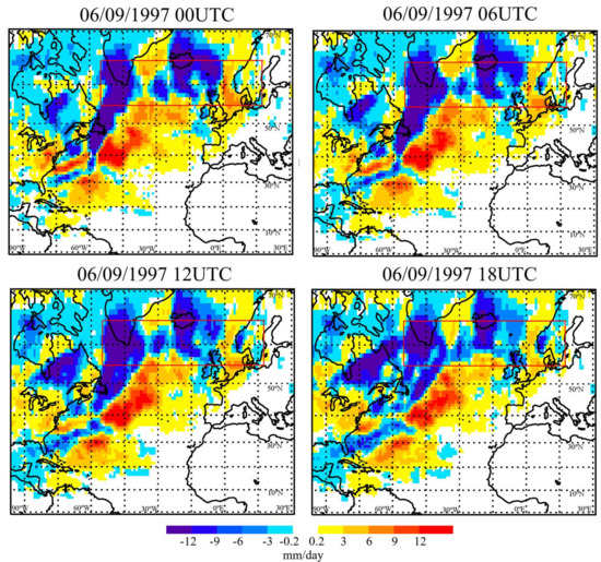 where (E) and (P) are the rates of evaporation and precipitation per unit area, respectively; A is the area of the grid cell and K is the total number of particles in the atmospheric column. This methodology developed by Stohl and James [,] allows tracking of trajectories backward and forward in time. Forward tracking from source areas allows the study of moisture losses (regions where precipitation exceed evaporation) along the trajectories and then the identification of sinks of moisture ). In addition, backward tracking from a specific area allows identification of those regions where particles gained moisture (evaporation exceed precipitation) before reaching the area of interest. In our case, in other words, moisture sources were indicated by (). This methodology has been widely used in moisture transport analysis over different areas and has been associated with different precipitation systems [,,].