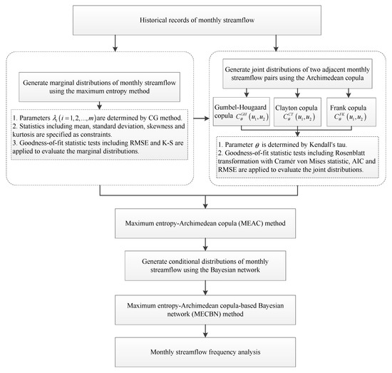 A maximum entropy-Archimedean copula (MEAC) method can be proposed through integrating techniques of maximum entropy and Archimedean copula into a general framework. In MEAC, the marginal distribution of monthly streamflow is constructed by the maximum entropy method and the joint distribution of two adjacent monthly streamflows is constructed by an Archimedean copula. The joint distribution of the MEAC method can be formulated as follows: